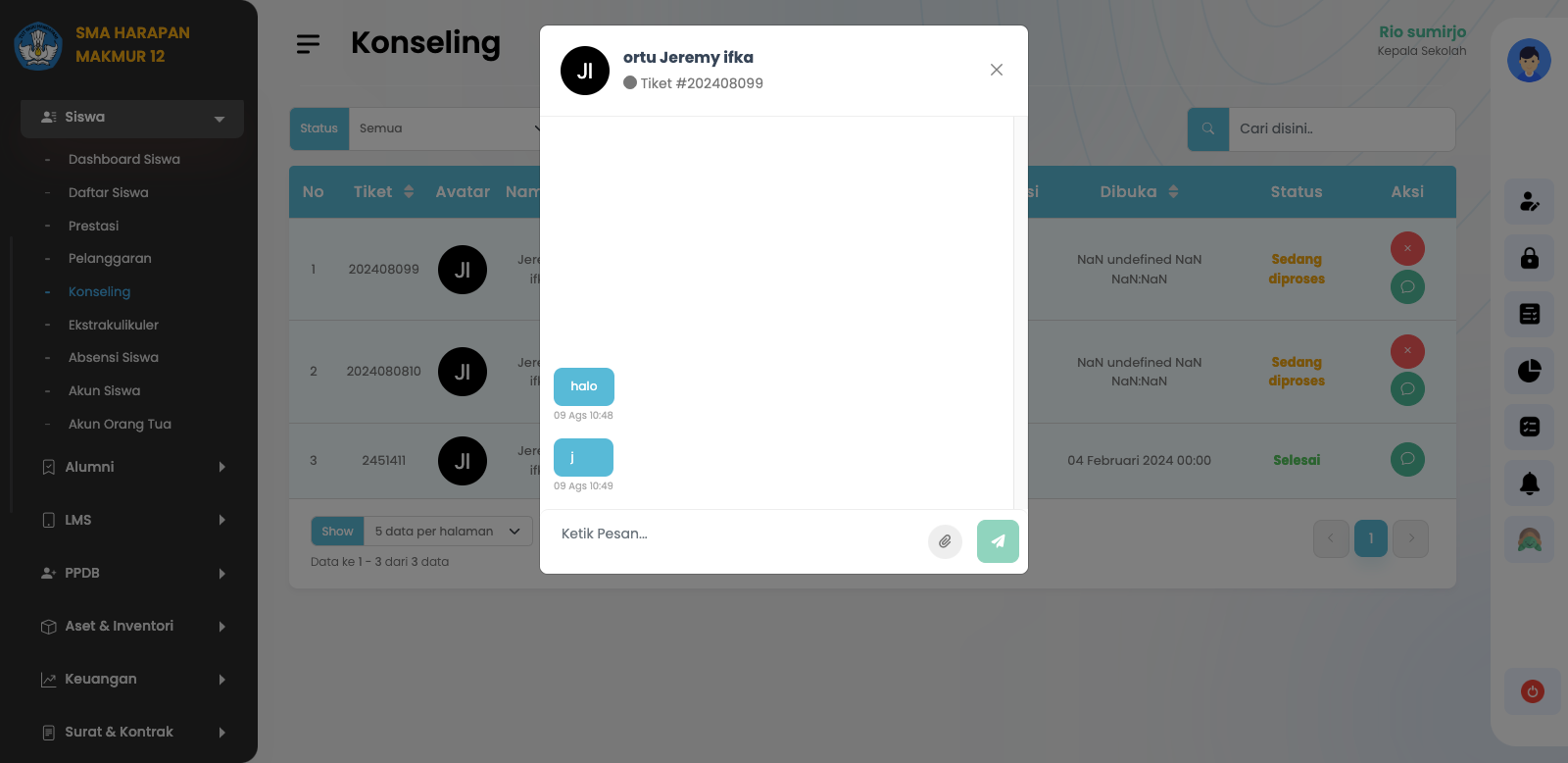 Fitur konseling siswa dirancang untuk meningkatkan efektivitas dan efisiensi layanan konseling di sekolah, serta membantu siswa mengatasi masalah pribadi dan akademik dengan lebih baik.